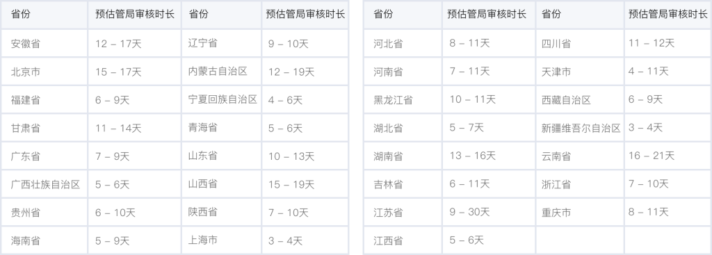 各個(gè)省管局預(yù)計(jì)審核時(shí)長,實(shí)際審核時(shí)長會(huì)根據(jù)備案場景有所不同,下表格僅供參考。詳情可查看 詳細(xì)規(guī)則。